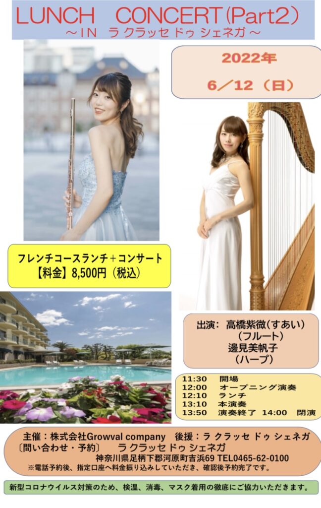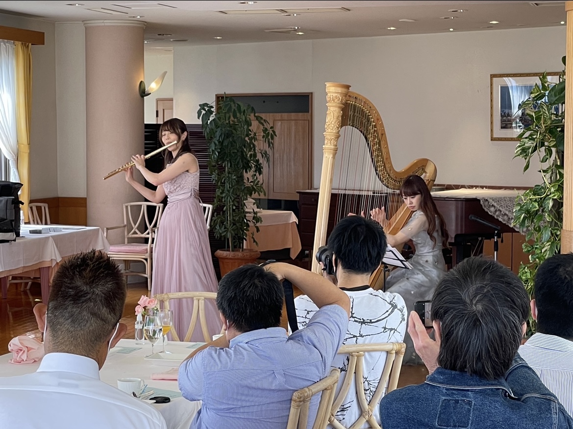 2022年6月12日、神奈川県湯河原の高級リゾートホテル、ラクラッセドゥシェネガにおいて、高橋紫微(フルート)さんと邉見美帆子さん(ハープ)のランチコンサートを開催しました。今回、2回目の開催でしたが。演奏もランチも好評で、大盛況でした!!
